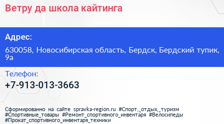 Ветру-да!, школа кайтинга по адресу 630058, Новосибирская область, Бердск, Бердский тупик, 9а в дальнейшем Организация, размещена в следующих категориях: