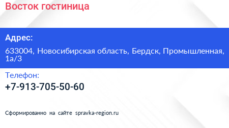 Восток, гостиница по адресу 633004, Новосибирская область, Бердск, Промышленная, 1а/3 в дальнейшем Организация, размещена в следующих категориях: