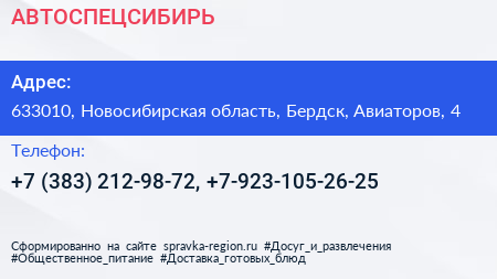 АВТОСПЕЦСИБИРЬ по адресу 633010, Новосибирская область, Бердск, Авиаторов, 4 в дальнейшем Организация, размещена в следующих категориях: