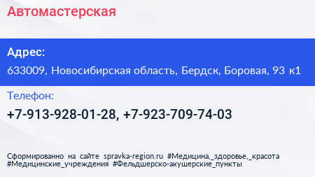 Автомастерская по адресу 633009, Новосибирская область, Бердск, Боровая, 93 к1 в дальнейшем Организация, размещена в следующих категориях: