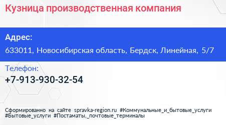 Кузница, производственная компания по адресу 633011, Новосибирская область, Бердск, Линейная, 5/7 в дальнейшем Организация, размещена в следующих категориях: