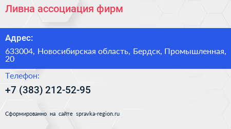 Ливна, ассоциация фирм по адресу 633004, Новосибирская область, Бердск, Промышленная, 20 в дальнейшем Организация, размещена в следующих категориях: