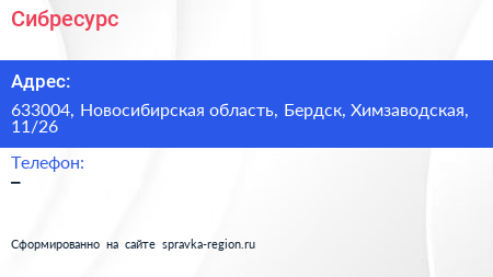 Сибресурс по адресу 633004, Новосибирская область, Бердск, Химзаводская, 11/26 в дальнейшем Организация, размещена в следующих категориях: