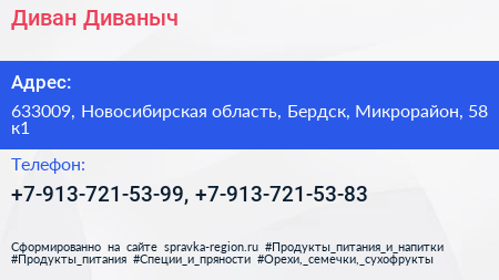 Диван Диваныч по адресу 633009, Новосибирская область, Бердск, Микрорайон, 58 к1 в дальнейшем Организация, размещена в следующих категориях: