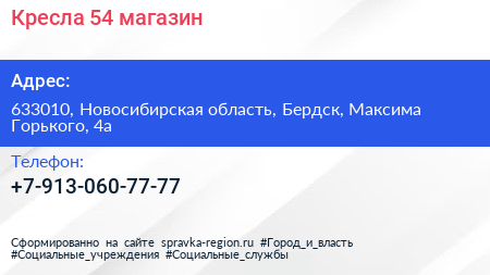 Кресла 54, магазин по адресу 633010, Новосибирская область, Бердск, Максима Горького, 4а в дальнейшем Организация, размещена в следующих категориях: