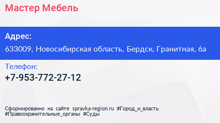 Мастер-Мебель по адресу 633009, Новосибирская область, Бердск, Гранитная, 6а в дальнейшем Организация, размещена в следующих категориях: