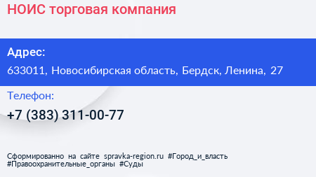 НОИС, торговая компания по адресу 633011, Новосибирская область, Бердск, Ленина, 27 в дальнейшем Организация, размещена в следующих категориях: