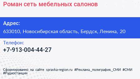 Роман, сеть мебельных салонов по адресу 633010, Новосибирская область, Бердск, Ленина, 20 в дальнейшем Организация, размещена в следующих категориях: