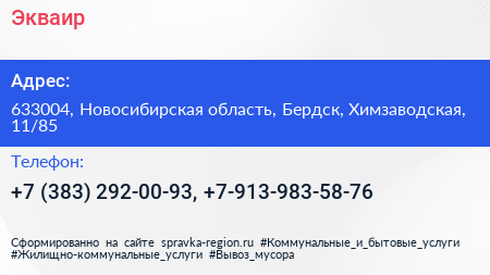 Экваир по адресу 633004, Новосибирская область, Бердск, Химзаводская, 11/85 в дальнейшем Организация, размещена в следующих категориях: