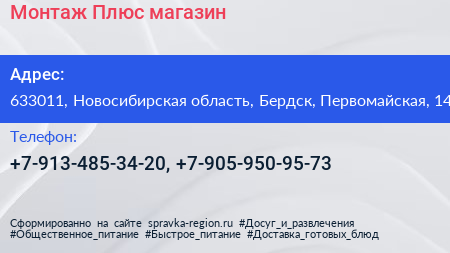 Монтаж Плюс, магазин по адресу 633011, Новосибирская область, Бердск, Первомайская, 14 в дальнейшем Организация, размещена в следующих категориях: