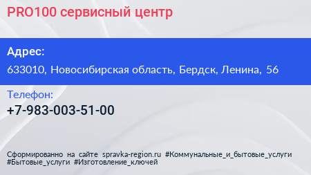 PRO100, сервисный центр по адресу 633010, Новосибирская область, Бердск, Ленина, 56 в дальнейшем Организация, размещена в следующих категориях: