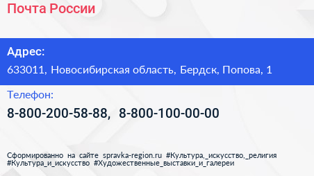 Почта России по адресу 633011, Новосибирская область, Бердск, Попова, 1 в дальнейшем Организация, размещена в следующих категориях: