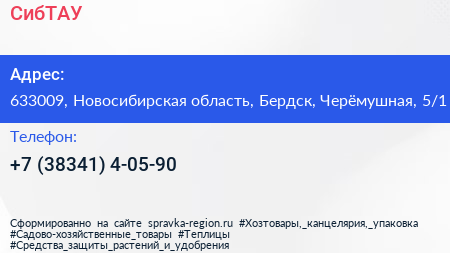 СибТАУ по адресу 633009, Новосибирская область, Бердск, Черёмушная, 5/1 в дальнейшем Организация, размещена в следующих категориях: