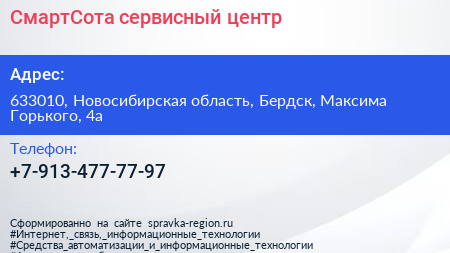 СмартСота, сервисный центр по адресу 633010, Новосибирская область, Бердск, Максима Горького, 4а в дальнейшем Организация, размещена в следующих категориях: