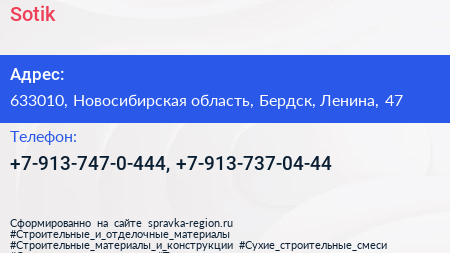 Sotik по адресу 633010, Новосибирская область, Бердск, Ленина, 47 в дальнейшем Организация, размещена в следующих категориях:
