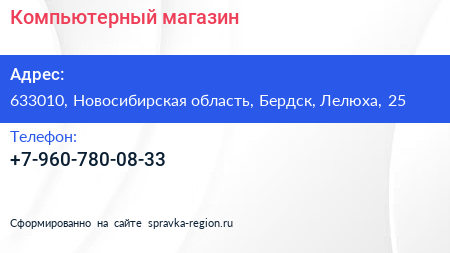 Компьютерный магазин по адресу 633010, Новосибирская область, Бердск, Лелюха, 25 в дальнейшем Организация, размещена в следующих категориях: