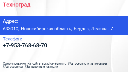 Техноград по адресу 633010, Новосибирская область, Бердск, Лелюха, 7 в дальнейшем Организация, размещена в следующих категориях: