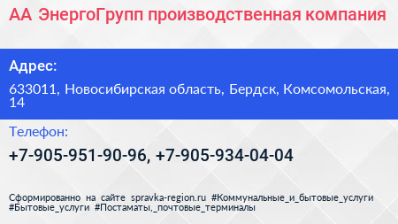 АА ЭнергоГрупп, производственная компания по адресу 633011, Новосибирская область, Бердск, Комсомольская, 14 в дальнейшем Организация, размещена в следующих категориях: