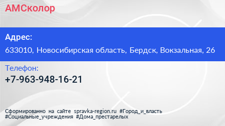 АМСколор по адресу 633010, Новосибирская область, Бердск, Вокзальная, 26 в дальнейшем Организация, размещена в следующих категориях: