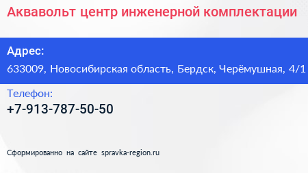 Аквавольт, центр инженерной комплектации по адресу 633009, Новосибирская область, Бердск, Черёмушная, 4/1 в дальнейшем Организация, размещена в следующих категориях: