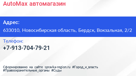 AutoMax, автомагазин по адресу 633010, Новосибирская область, Бердск, Вокзальная, 2/2 в дальнейшем Организация, размещена в следующих категориях: