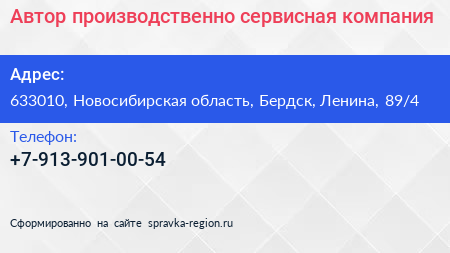 Автор, производственно-сервисная компания по адресу 633010, Новосибирская область, Бердск, Ленина, 89/4 в дальнейшем Организация, размещена в следующих категориях: