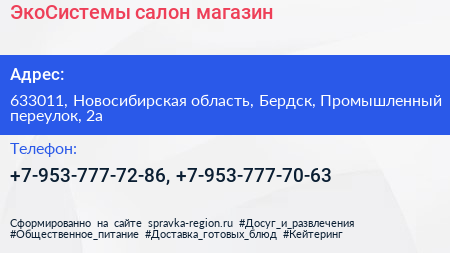 ЭкоСистемы, салон-магазин по адресу 633011, Новосибирская область, Бердск, Промышленный переулок, 2а в дальнейшем Организация, размещена в следующих категориях: