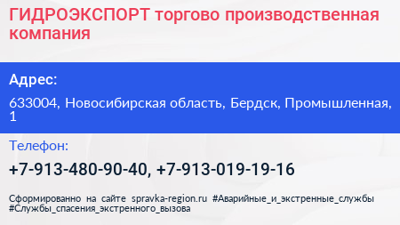 ГИДРОЭКСПОРТ, торгово-производственная компания по адресу 633004, Новосибирская область, Бердск, Промышленная, 1 в дальнейшем Организация, размещена в следующих категориях: