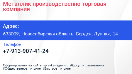 Металлик, производственно-торговая компания по адресу 633009, Новосибирская область, Бердск, Лунная, 14 в дальнейшем Организация, размещена в следующих категориях: