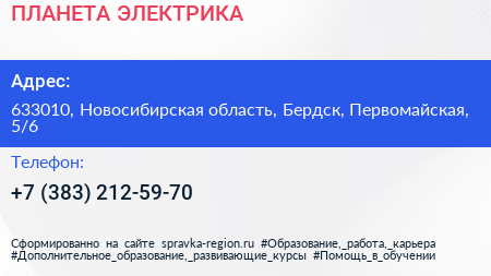 ПЛАНЕТА ЭЛЕКТРИКА по адресу 633010, Новосибирская область, Бердск, Первомайская, 5/6 в дальнейшем Организация, размещена в следующих категориях: