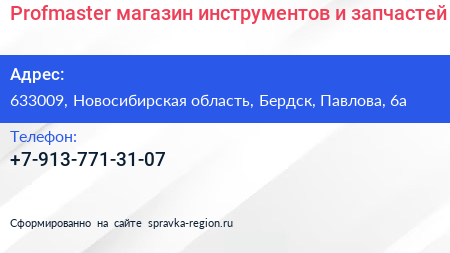 Profmaster, магазин инструментов и запчастей по адресу 633009, Новосибирская область, Бердск, Павлова, 6а в дальнейшем Организация, размещена в следующих категориях: