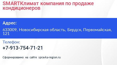 SMARTКлимат, компания по продаже кондиционеров по адресу 633009, Новосибирская область, Бердск, Первомайская, 121 в дальнейшем Организация, размещена в следующих категориях: