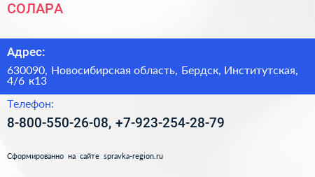 СОЛАРА по адресу 630090, Новосибирская область, Бердск, Институтская, 4/6 к13 в дальнейшем Организация, размещена в следующих категориях: