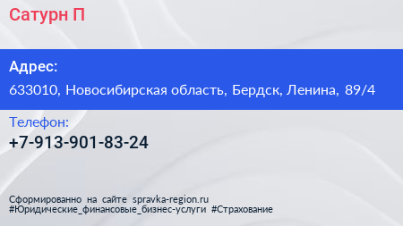 Сатурн-П по адресу 633010, Новосибирская область, Бердск, Ленина, 89/4 в дальнейшем Организация, размещена в следующих категориях: