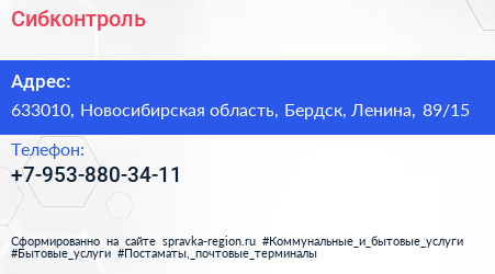 Сибконтроль по адресу 633010, Новосибирская область, Бердск, Ленина, 89/15 в дальнейшем Организация, размещена в следующих категориях:
