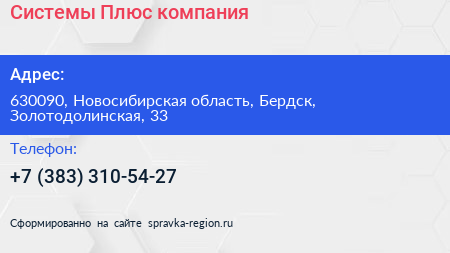 Системы Плюс, компания по адресу 630090, Новосибирская область, Бердск, Золотодолинская, 33 в дальнейшем Организация, размещена в следующих категориях: