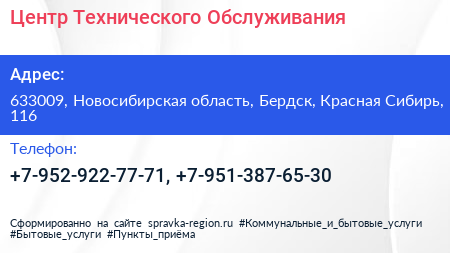 Центр Технического Обслуживания по адресу 633009, Новосибирская область, Бердск, Красная Сибирь, 116 в дальнейшем Организация, размещена в следующих категориях: