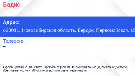 Бадис по адресу 633011, Новосибирская область, Бердск, Первомайская, 10 в дальнейшем Организация, размещена в следующих категориях: