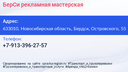 БерСи, рекламная мастерская по адресу 633010, Новосибирская область, Бердск, Островского, 55 в дальнейшем Организация, размещена в следующих категориях: