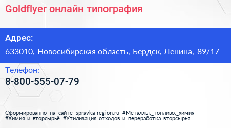 Goldflyer, онлайн-типография по адресу 633010, Новосибирская область, Бердск, Ленина, 89/17 в дальнейшем Организация, размещена в следующих категориях: