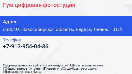 Гум, цифровая фотостудия по адресу 633010, Новосибирская область, Бердск, Ленина, 31/1 в дальнейшем Организация, размещена в следующих категориях: