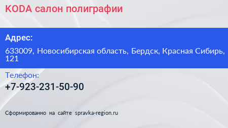 KODA, салон полиграфии по адресу 633009, Новосибирская область, Бердск, Красная Сибирь, 121 в дальнейшем Организация, размещена в следующих категориях: