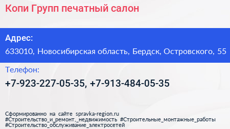Копи Групп, печатный салон по адресу 633010, Новосибирская область, Бердск, Островского, 55 в дальнейшем Организация, размещена в следующих категориях:
