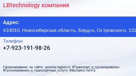 LBtechnology, компания по адресу 633010, Новосибирская область, Бердск, Островского, 122 в дальнейшем Организация, размещена в следующих категориях: