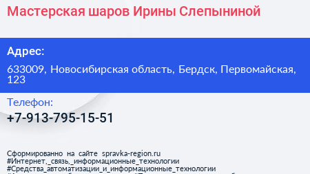 Мастерская шаров Ирины Слепыниной по адресу 633009, Новосибирская область, Бердск, Первомайская, 123 в дальнейшем Организация, размещена в следующих категориях: