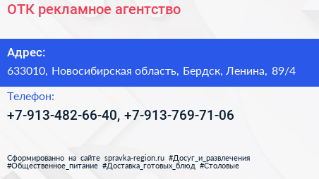 ОТК, рекламное агентство по адресу 633010, Новосибирская область, Бердск, Ленина, 89/4 в дальнейшем Организация, размещена в следующих категориях: