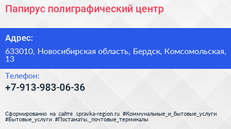 Папирус, полиграфический центр по адресу 633010, Новосибирская область, Бердск, Комсомольская, 13 в дальнейшем Организация, размещена в следующих категориях: