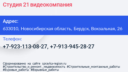Студия 21, видеокомпания по адресу 633010, Новосибирская область, Бердск, Вокзальная, 26 в дальнейшем Организация, размещена в следующих категориях: