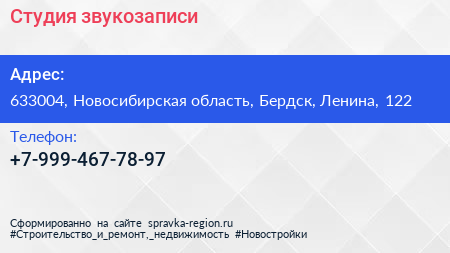 Студия звукозаписи по адресу 633004, Новосибирская область, Бердск, Ленина, 122 в дальнейшем Организация, размещена в следующих категориях: