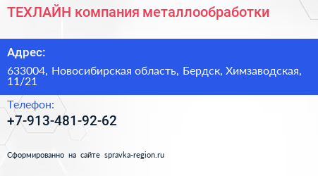 ТЕХЛАЙН, компания металлообработки по адресу 633004, Новосибирская область, Бердск, Химзаводская, 11/21 в дальнейшем Организация, размещена в следующих категориях: